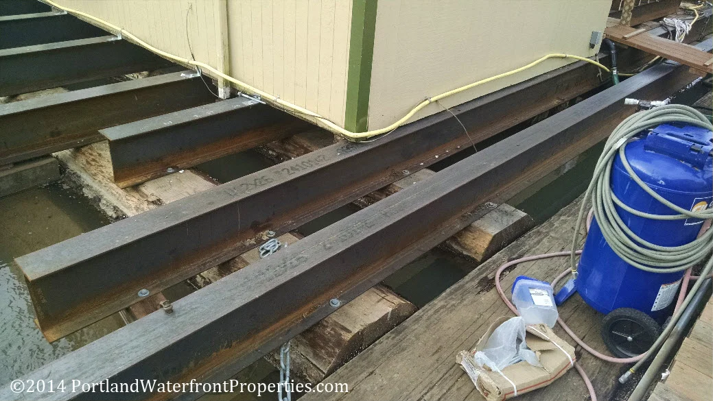 Log float undergoing stringer replacement. Logs running under the length of the house. New steel stringers replacing aged wood stringers and being installed across the tops of the logs.